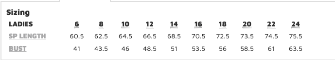 Bust | 41 | 43.5 | 46 | 48.5 | 51 | 53.5 | 56 | 58.5 | 61 | 56.5 |